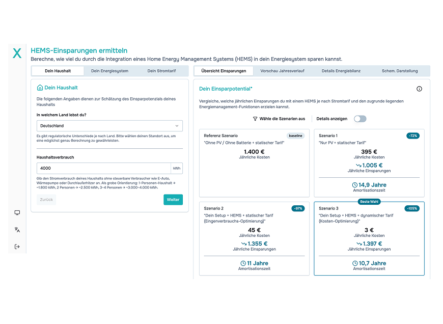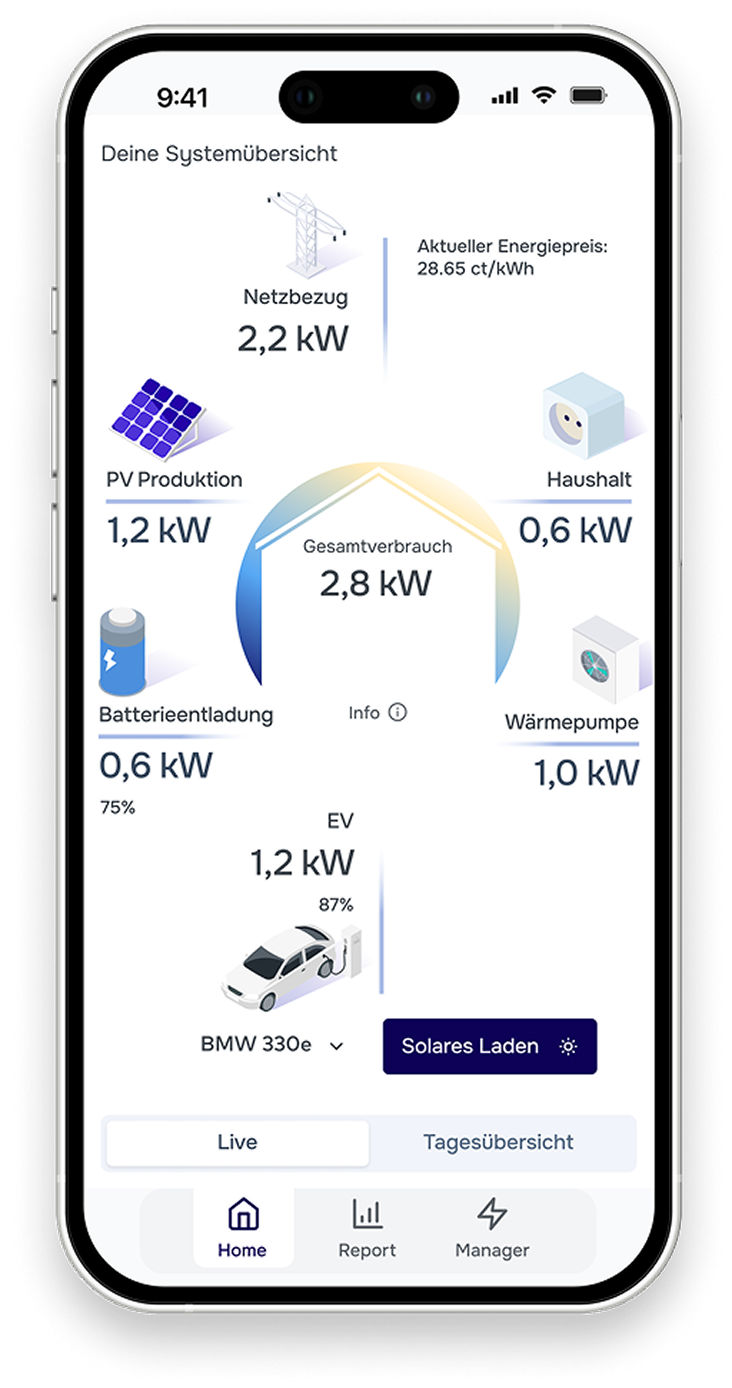 Die HEMOS Lösung wirkt wie ein Finanz-Turbo für die gesamte Anlage: Durch intelligente Verteilung von Solarstrom und die Nutzung günstiger Börsenpreise (dynamische Tarife) können zusätzlich bis zu 1.000 € pro Jahr gespart werden. Die Einsparungen können bequem per App verfolgt werden.