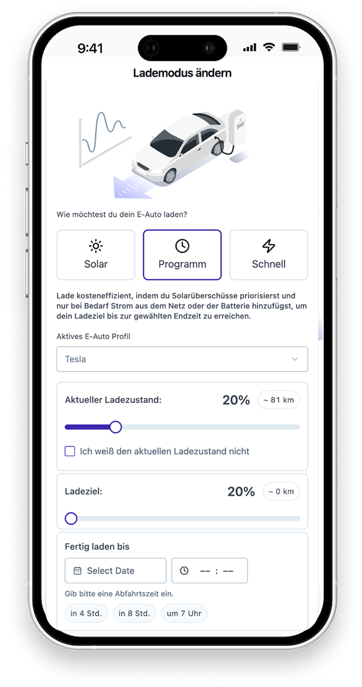 HEMOS nutzt verschiedene Lademodi - unter anderem intelligentes Zielzeit-Laden. Der Kunde sagt nur: "Morgen früh will ich 80% haben." HEMOS berechnet den perfekten Mix aus eigener PV-Erzeugung, Kapazität des Stromspeichers und günstigem Netzstrom.